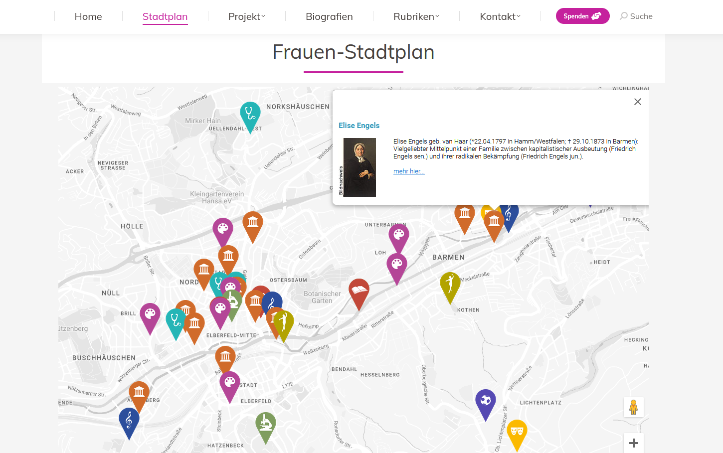 Unter den 17 Nachhaltigkeitszielen der Vereinten Nationen wird die Geschlechtergerechtigkeit und die nachhaltige Gestaltung der Städte aufgeführt. Aber Frauen und deren Geschichte werden bisher in Wuppertal kaum berücksichtigt. Zum Beispiel sind nur 3 % der Straßen in Wuppertal nach Frauen benannt. Frauen tauchen nicht auf oder gehen unter. Das möchte der gemeinnützige Verein Wupperfrauen e.V. ändern und Frauen in Wuppertal sichtbarer machen. In einem virtuellen Stadtplan und Biografien werden sie auf einer Webseite dargestellt.